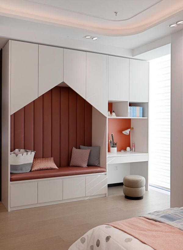 细腻的条纹背景墙奠定了温馨的基础色调,斜角门板与软包、书柜休闲区一体化打造私密空间,可满足儿童的自主性和拥有感。低饱和度的伯爵橙和神秘灰相搭配,颜色饱和度更低,减缓视觉疲劳。