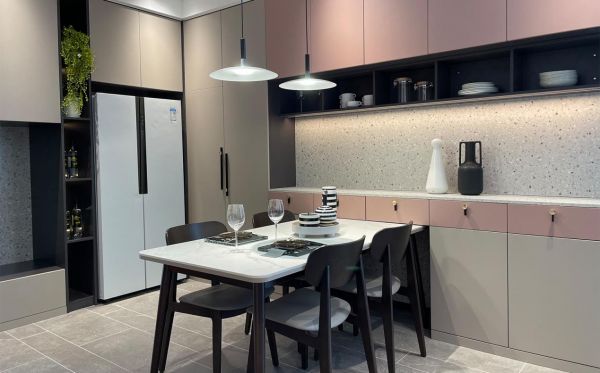 L形型餐边柜完美的嵌入电器,门板与开放格灵活组合解决餐厅储物难题,使用起来最顺手。餐边柜层板灯也是采用的卡扣式免胶安装工艺,灯光向内斜照,温和不刺眼,为就餐空间提供更温馨的照明。将精致与优雅贯穿到每一次餐食。