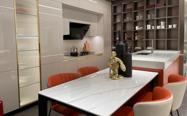台下盆工艺,承重强,不易坠盆,易打理无死角;T型布局,集烹饪收纳于一体;地柜门板造型与拉手一体化设计,突出线条感,金色拉手彰显轻奢质感;开放式吊柜搭配条形灯带,为厨房添加几分静谧浪漫。