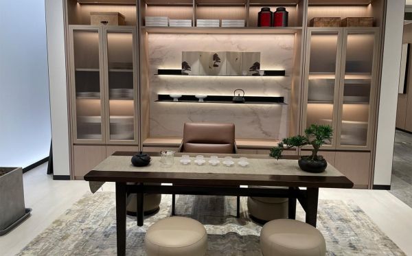 定制电视柜的石材纹理搭配金属拉手,门板的宣纸肌理,将绢布色彩纹理运用到模压过程,还原宣纸匀润质感,呼应摆件、挂画的水墨元素,水墨香气满溢家中,与沙发的皮质和金属腿遥相呼应,柜体的烟熏橡木又与成品沙发的水曲柳相呼应,整体家居风格统一,氛围轻松拿捏。开放格背板采用了赤豆沙色,沙发用的是三防面料,都是做过防污防水防磨处理的,抹布一擦就干净,后期打理也很方便。