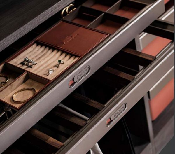 简·爱保罗的衣柜精确把握年轻群体的消费心理,以拥有高级质感的中性灰作为主调,辅以爱马仕橙与金属色作搭配。在简·爱保罗设计师的手下,安静的中性灰遇到耀眼的爱马仕橙,打破原本传统阴郁的空间氛围,为单调的空间注入了新鲜活力,演绎出时尚经典的别样轻奢,最大程度地发挥衣柜的时尚魅力,给人以绚丽时尚的视觉观感。