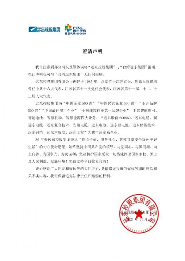 11月22日,远东控股集团发布澄清声明:我司注意到部分网友及媒体误将“远东控股集团”与“台湾远东集团”混淆,在此声明我司与“台湾远东集团”无任何关联。坚决拥护国家采取一切措施捍卫国家主权、领土及人民利益、发展环境!坚决支持早日收复台湾!