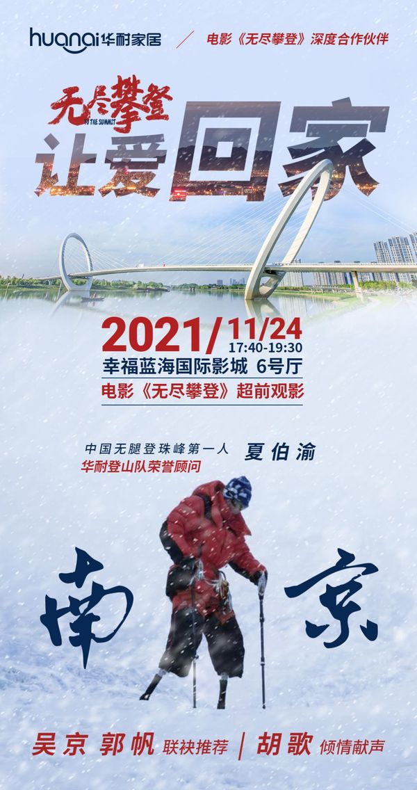 在此我们也预祝电影《无尽攀登》华耐家居全国巡演之旅圆满成功,11月24日南京站巡演,让我们一起喊出那个响亮的口号:人生不怕晚!就怕你不敢!