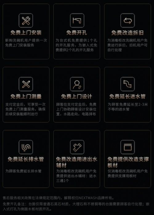 购买后也无需忧心安装和售后,大部分品牌的洗碗机的安装辅料钱都需要客户来承担,而NEXTWASH不仅送货上门还提供安装全包服务,以下辅料都无需客户承担费用。客户也可享受全国联保,有专业师傅上门安装维修,一年整机保修,15天质量问题以换代修,7天无理由退换,有专属客服提供专业的售前售后服务。