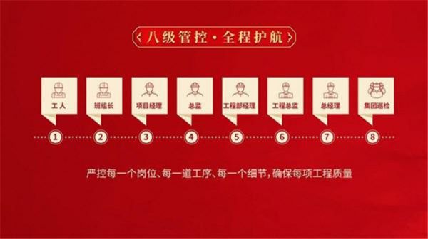 为把控施工质量与工艺标准,金煌家装严格执行8级质量卓越交付工程管控,由工人、班组长、项目主管,到监理、工程部经理、工程总监,再到总经理、集团巡检组成,实施层层把关,所有环节还要经过客户满意度、质量验收评定、班组工人水平、文明形象考核,从每一个岗位、每一道工序、每一个细节,严抓、严管、严控,确保每项工程质量。