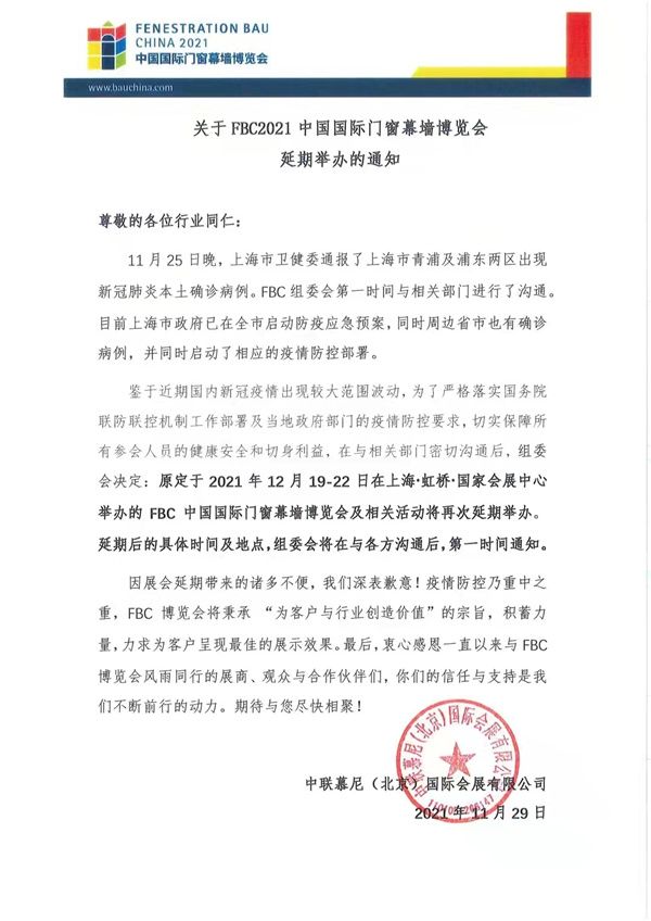 门窗快讯|FBC2021 中国国际门窗幕墙博览会延期举办