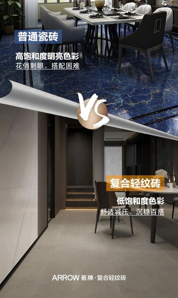 饱和度过高,即色彩过度鲜艳,长期看就会形成审美疲劳,刺激人的五官,带来不适感。而明度指的是颜色的亮度,假如地面铺贴明度过低的瓷砖,就会有种“头轻脚重”的感觉,显得格外压抑。