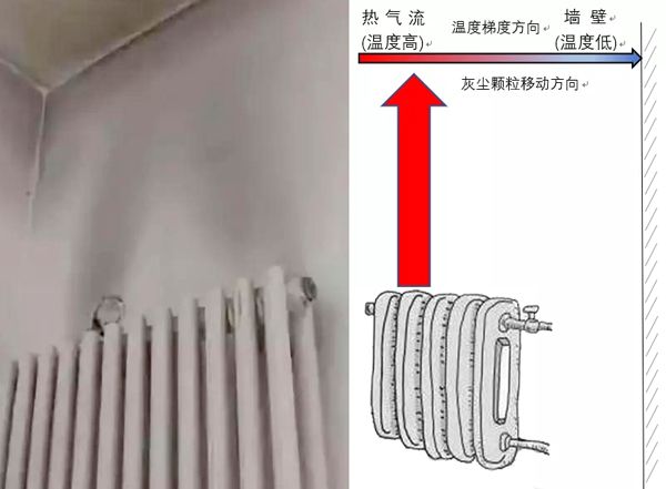 暖气片熏墙真的是因为你买到了山寨的暖气片?当然不是,其实对于未经过防熏墙处理的暖气片来说,熏墙是一个常见的现象,而这个现象就是所谓的热泳现象:指粒子在具有温度梯度的气体中,由于较高温部分的气体分子要比较低温部分的气体分子以更高的动能与粒子碰撞,导致粒子从高温部分向低温部分移动的现象。直白来说,那就是因为暖气片和背后的墙体之间存在温度梯度,空气流过它们之间时,空气中含有的粉尘类固体颗粒物会吸附到较冷的墙面上,导致墙壁被熏黑了。