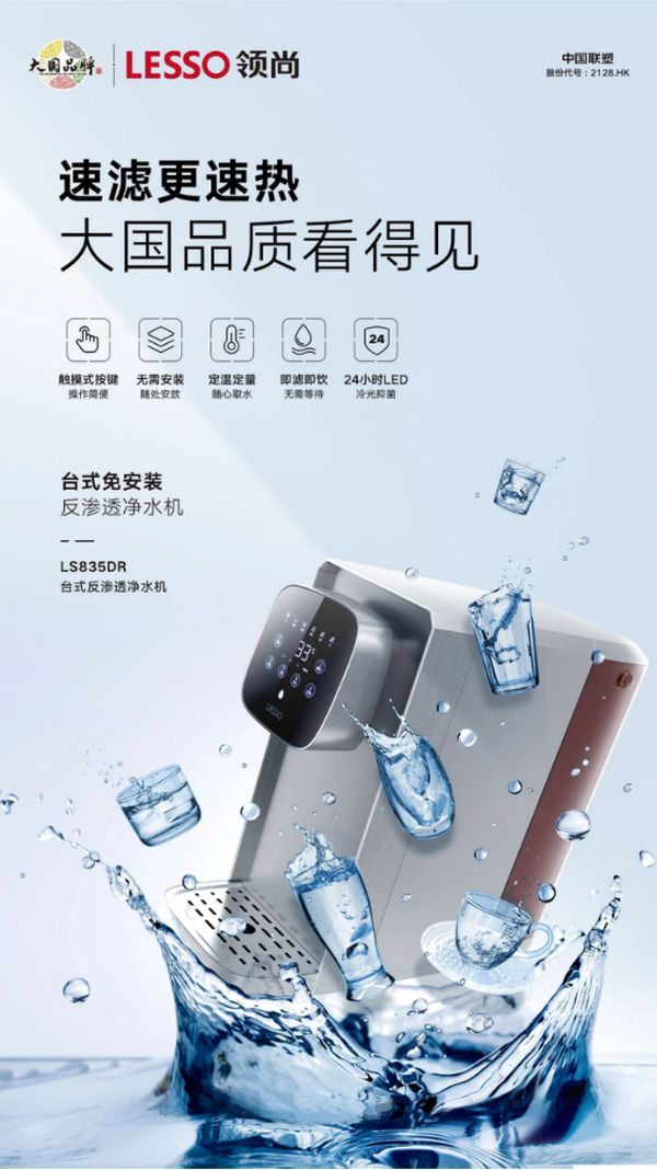 领尚台式反渗透净水机免安装、可直饮、可定制出水模式,融入了先进的净化技术,让家庭饮水更加高效、便捷、安心。作为CCTV1-1《大国品牌》入选企业中国联塑旗下重要产品项目,其采用的净水技术不仅达到了直饮标准,还更符合人体健康需求。