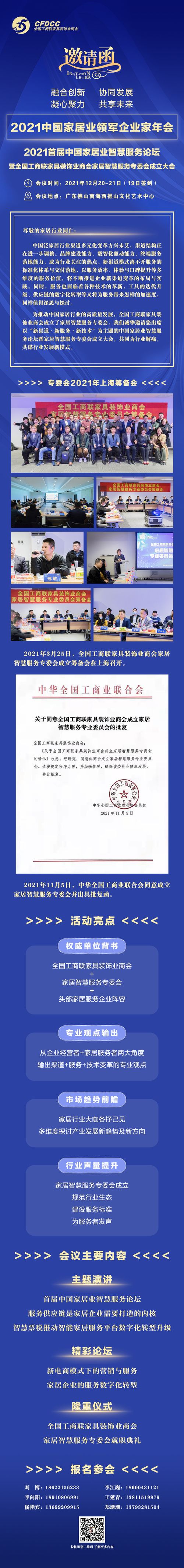 家居智慧服务专委会将在全国工商联家具装饰业商会主办的2021中国家居业领军企业年会的百强供应链展示区正式华丽亮相。同时,家居智慧服务专委会将围绕“新渠道、新服务、新技术”的话题举办首届家居智慧服务高峰论坛暨全国工商联家具装饰业商会家居智慧服务专委会成立大会。
