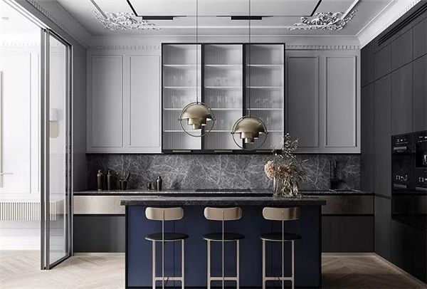 深蓝色的岛台、灰色大理石纹,时尚的石膏线,艺术十足的金属吊灯,白色的厨柜,深灰色的背景,鱼骨拼的木色地板,任何细节的斟酌都会带来质感的回馈,对生活的要求,多么精细也不为过。