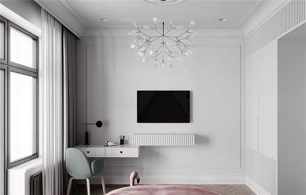卧室大大的落地窗,浅灰色的窗帘纯净优雅,天花板的艺术吊灯带成了点睛之笔,粉色的背景装饰很童真很浪漫,配上粉色的床品,将时尚与精致真实展观出来。