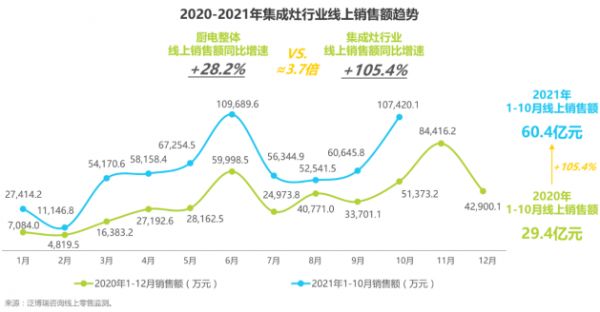 2021年,集成灶线上市场迎来快速增长期,根据《集成灶消费者与市场洞察报告》显示,2021年1-10月线上集成灶线上销售量超87万台,对比同期增长85.0%;销售额累计达60.4亿元,同比增长超105%;品类增长速度约为厨电整体市场线上销售额增速的3.7倍。
