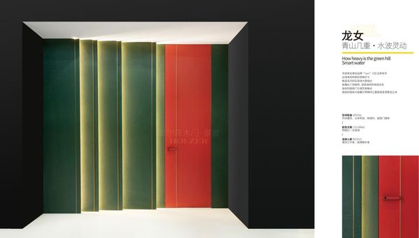 “龙女”打破了传统木门的工艺限制,利用金属线条门+墙板的同水平延伸,将无框超高木门与墙面完美融合。运用独特大胆的色彩设计,高饱和度的明艳红搭配内敛低调的石苔绿,衍生出兼具艺术气息与功能性的木作家居,赋予家居生活更为独到的东方韵味。