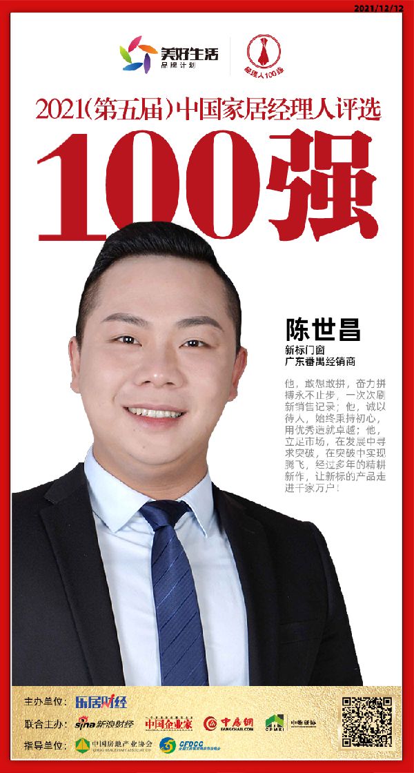 新浪家居讯 12月12日,2021(第五届)中国地产新时代盛典在北京举行,“2021中国家居经理人100强”榜单正式揭晓。新标门窗广东番禺经销商陈世昌荣获“2021中国家居经理人100强”。