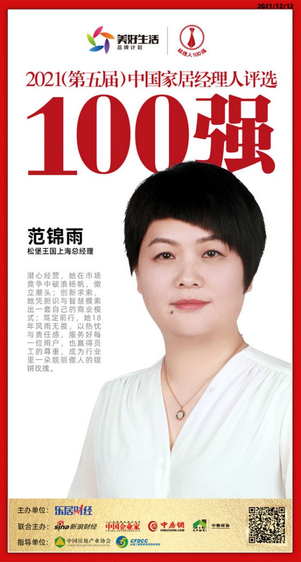 新浪家居 12月12日,2021(第五届)中国地产新时代盛典在北京举行,“2021中国家居经理人100强”榜单正式揭晓。松堡王国上海总经理范锦雨荣获“2021中国家居经理人100强”。