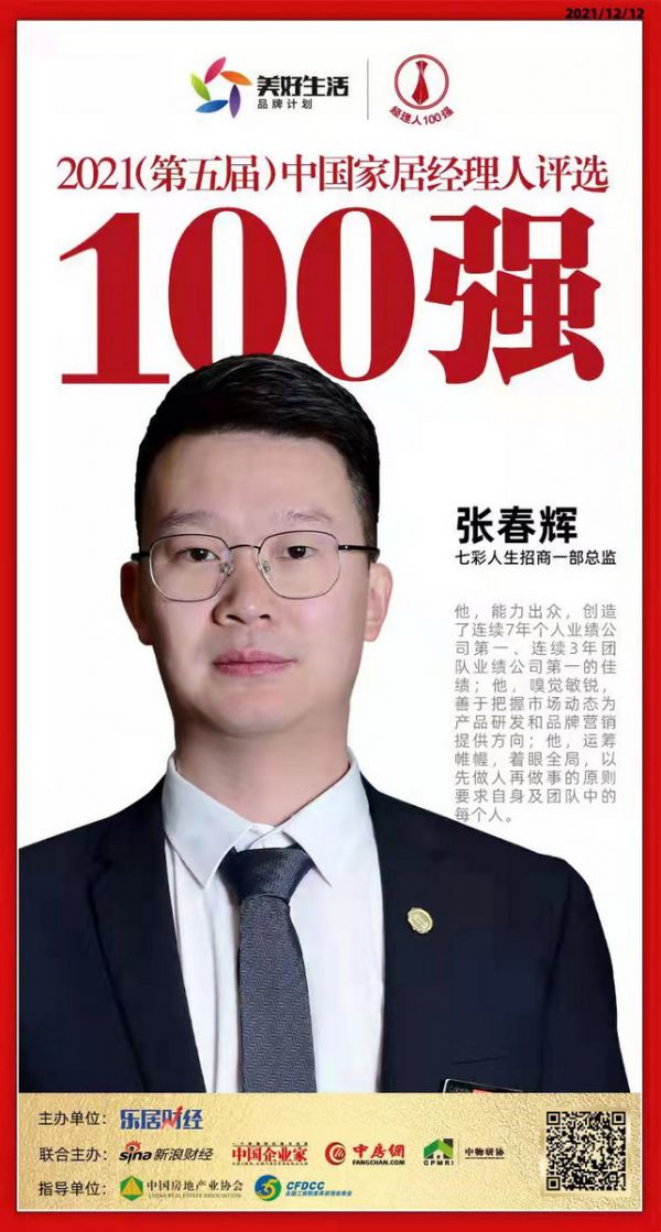 新浪家居讯 12月12日,2021(第五届)中国地产新时代盛典在北京举行,“2021中国家居经理人100强”榜单正式揭晓。七彩人生招商一部总监张春辉荣获“2021中国家居经理人100强”。