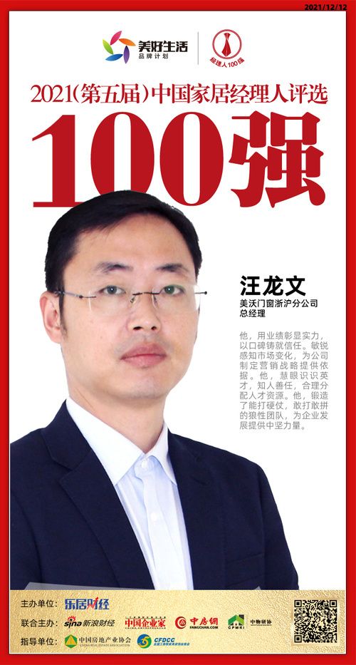 新浪家居12月12日,2021(第五届)中国地产新时代盛典在北京举行,“2021中国家居经理人100强”榜单正式揭晓。美沃门窗浙沪分公司总经理汪龙文荣获“2021中国家居经理人100强”。