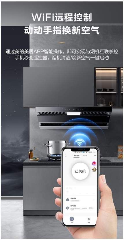 美的搭建了全方位智慧厨房平台,用户可通过美的美居APP直接下达指令,只要动动手指就可以自定义烟感,根据自己的烹饪需要进行调整,小火炖煮小风量,疾火爆炒大风量。做完饭发现忘记开启空气焕新模式,厨房油烟还闷在里面,自己可以使用远程操控功能开启空气焕新。可以说,新静吸系列玲珑油烟机CQ5是一台可以与整个厨房乃至整个房间互联共通的,可以实现情感流转的智能化体验中心。