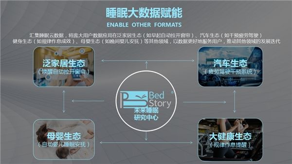 Bedstory眠里故事,以床垫为切入,逐步建立睡眠智能生态,帮助人们找到更适合自己的深度睡眠;通过云端大数据,能够让人们更深入地感知自己的睡眠信息,同时经过分析计算,将庞大用户数据应用在泛家居生态、汽车生态、母婴生态、大健康生态等领域,以数据更好地服务用户,推动其他领域的发展迭代。