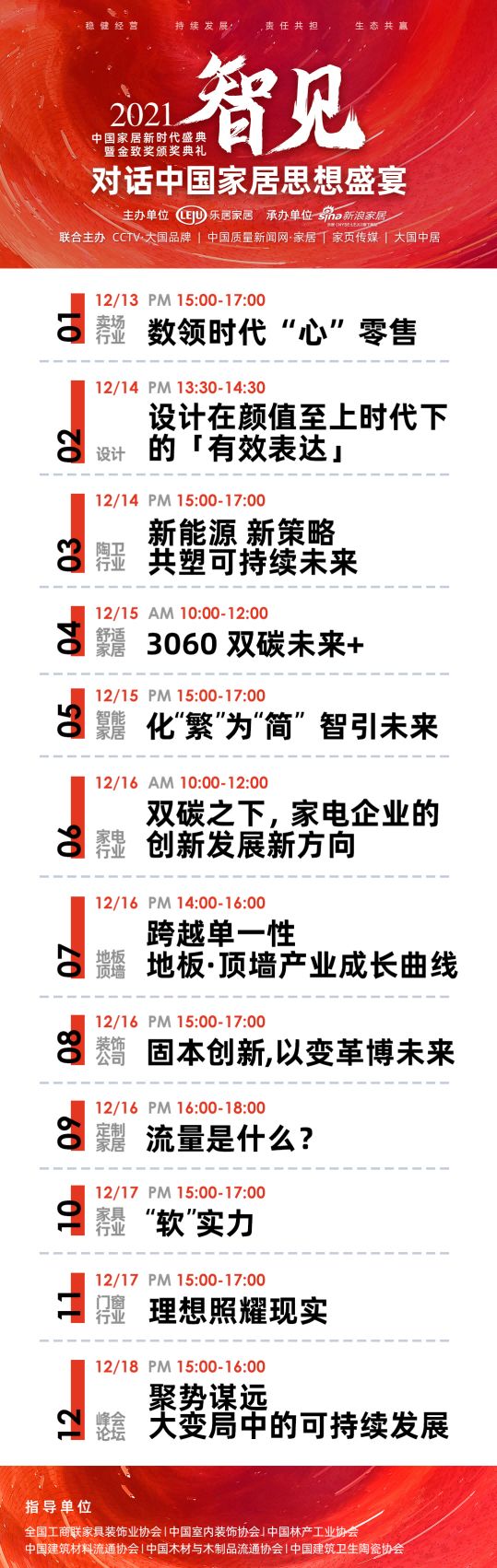 由乐居家居、新浪家居主办,CCTV·大国品牌、中国质量新闻网·家居、家页传媒、大国中居协办,全国工商联家具装饰业协会、中国室内装饰协会、中国林产工业协会、中国建筑材料流通协会、中国木材与木制品流通协会、中国建筑卫生陶瓷协会、广东省家居业联合会共同指导的《智见·2021中国家居新时代盛典暨金致奖颁奖典礼》——「对话中国家居思想盛宴」于12月13日正式开启。