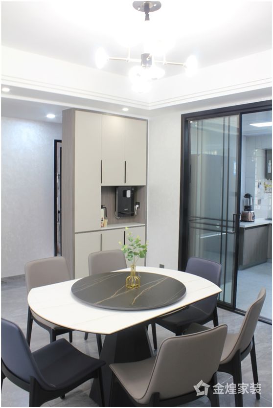餐厅与客厅在同一空间里,采用黑、白、灰永恒三色提升了整体空间的高级感,岩板纹理的餐桌,搭配灰色的餐椅,显得端庄优雅而又文艺舒适。