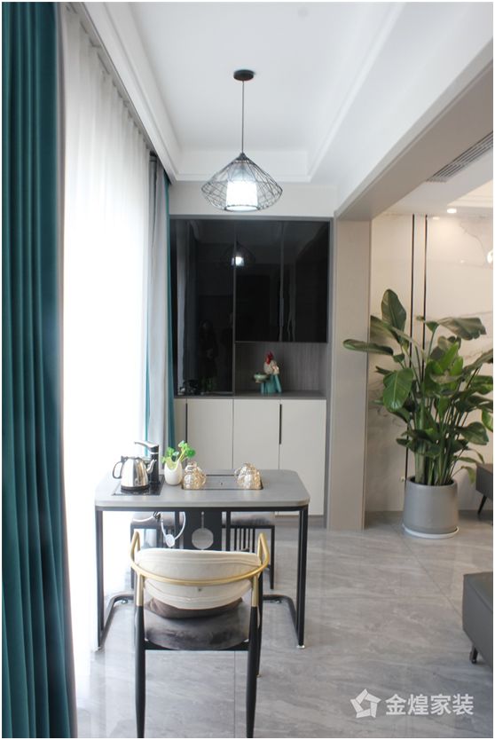 客厅与阳台空间打通,布置上桌椅,摆设成主人喝茶招待客人或工作看书的小区域,旁边定制一个收纳柜可以做日常收纳,也能当做书柜使用,简洁现代的布置,方便又实用。