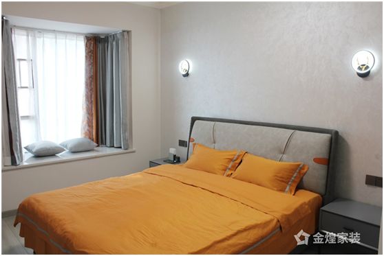 卧室采用奶咖色墙布,营造简洁自然安静的睡眠空间,搭配温馨且柔和的壁灯,干净利落,使人安静且进入梦乡,阳台利用原本区域,将窗户外移,打造出舒适的休闲飘窗。