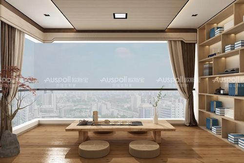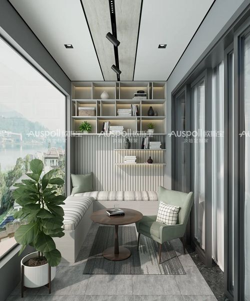 如果你的家里很大,有两个阳台,不妨把其中一个作为茶室,以茶待客,以茶会友。阳台外侧安装落地玻璃。成为封闭式的茶室。用朴素优雅的窗帘融入其中,映衬出茶室的优雅端庄。天花板搭配极简定制大板,与空间一步步达成完美的契合。旁边还可以沿着墙面做书架,收纳茶具。淌洋在茶的世界里闲谈,简直不要太美好。