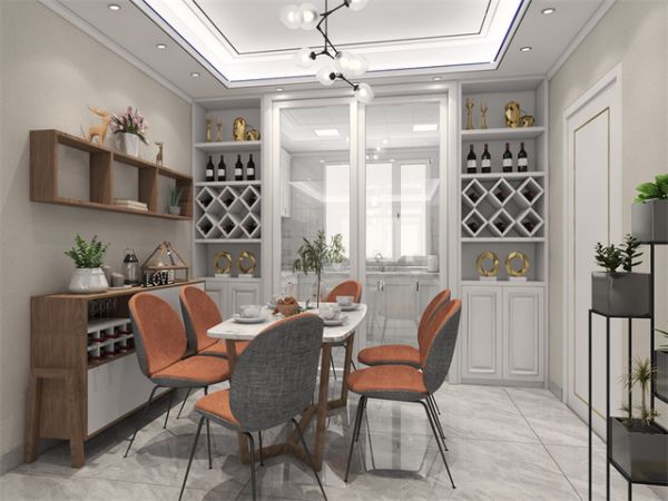 餐厅用橙色椅子做配色,增加空间的活泼感,以乳白色墙面为主,搭配原木色边柜,既方便使用,也能增强储藏功能,厨房墙体改酒柜,利用空间也增强美观,酒柜还是选用白色,与墙面呼应,也能使空间更加明亮,适合北欧轻奢的风格。