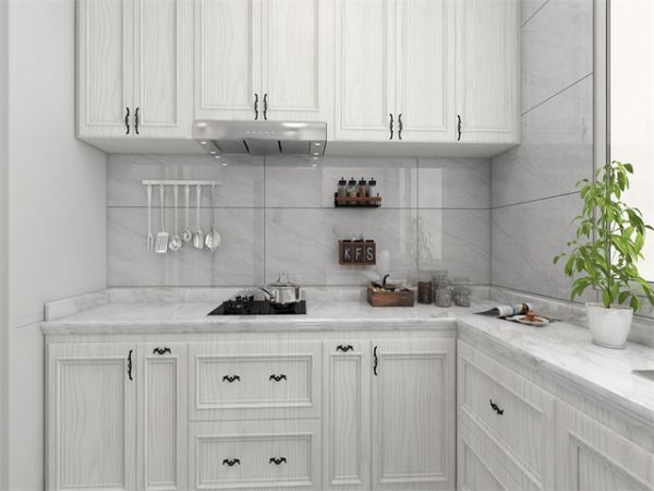 厨房墙面采用创锐瓷砖400*800MM规格全瓷中板,浅灰的色调,搭配白枫木纹路的橱柜门,加上凹槽的门板造型,让厨房也充满了北欧风,视觉上干净纯洁,有年轻活泼之感。橱柜采取L型布局,增强空间利用性,方便拿取与储藏物品。