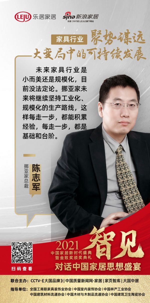 陈志军认为,当前家具行业目前面临的困境是短期现象,随着消费者要求越来越高,将来不会全部依赖设计师。市场无情的,转型是为了生存。未来家具行业是小而美还是规模化,目前没法定论。但挪亚家将继续坚持工业化、规模化的生产路线,这样每走一步,都能积累经验,每走一步,都是基础和台阶。