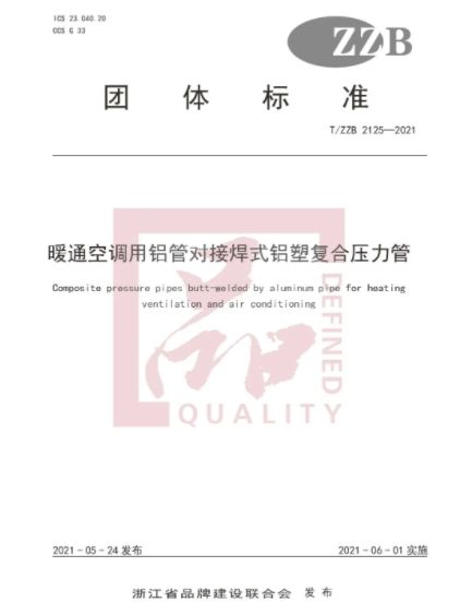 由浙江蔡司管道科技有限公司为主起草的“浙江制造”团体标准《暖通空调用铝管对接焊式铝塑复合压力管》经过立项、工作组研制、专家评审、各部门报批的流程,于2021年6月1日发布实施。