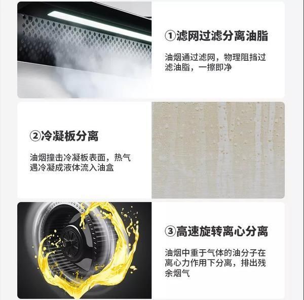 通过滤网过滤分离、烟腔冷凝板冷凝、高速旋转离心分离,就可以分离出油烟中的油分子。