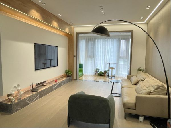 客厅是清新自然色调的家居色,温暖柔和极具张力,无主灯的安置恰到好处,勾勒出艺术线条美感,照亮整个空间。