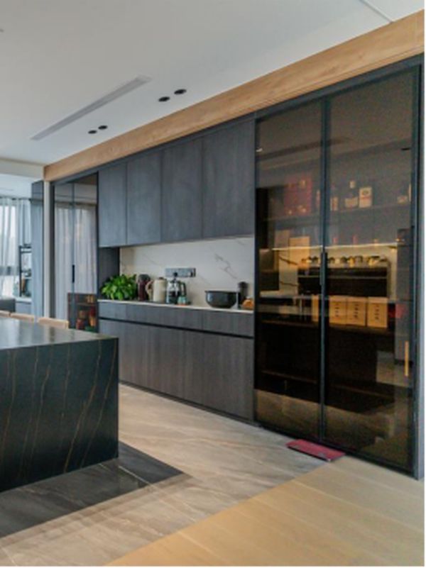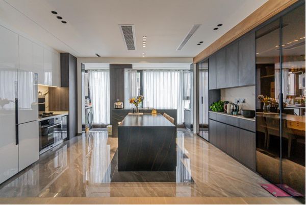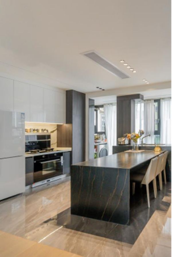 开放式厨房和客厅面积相差不多,空间非常开阔,但是色调上呈现出鲜明的反差,厨房中央是一个黑金岩板T型大岛台,集餐桌和水槽于一体,洗菜、烹饪、吃饭形成三角区,非常方便。一侧是森歌A8Z蒸箱款集成灶,黑晶玻璃与不锈钢的外观设计简约大气,另一侧是可储物、可展示的玻璃酒柜。