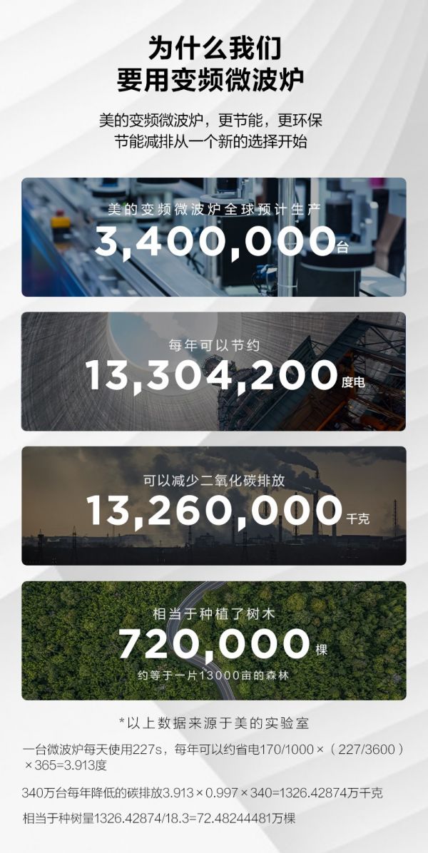 根据美的实验室数据统计,美的变频微波炉每年全球预计生产340万台,年均节约1330万度电,减少二氧化碳排放约1.3万吨,相当于种植树木约72万棵,这个数字约等于一片13000亩的森林,面积超过1200个国际标准足球场大小。深入各个环节,美的全价值链贯彻落实“微碳生活计划”,通过优化产业结构、形成绿色供应链、提升低碳科技创新力,大力探索产品在生产环节有效碳减排的新可能。进入消费者生活使用场景,美的也同样聚焦于节能减排,立足产品,推动作为行业高端技术代表之一的微波变频技术广泛普及。