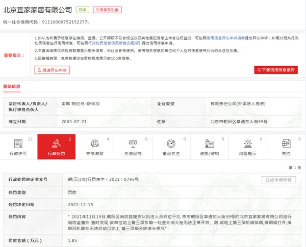 新浪定制频道讯 12月15日,北京朝阳区消防救援支队向北京宜家家居有限公司(简称“北京宜家家居”)下发两份行政处罚决定书。处罚原因为消防设施器材未保持完好有效、未开展消防安全教育和消防知识培训、定期进行灭火技术训练,两份决定书合计罚款3.45元。