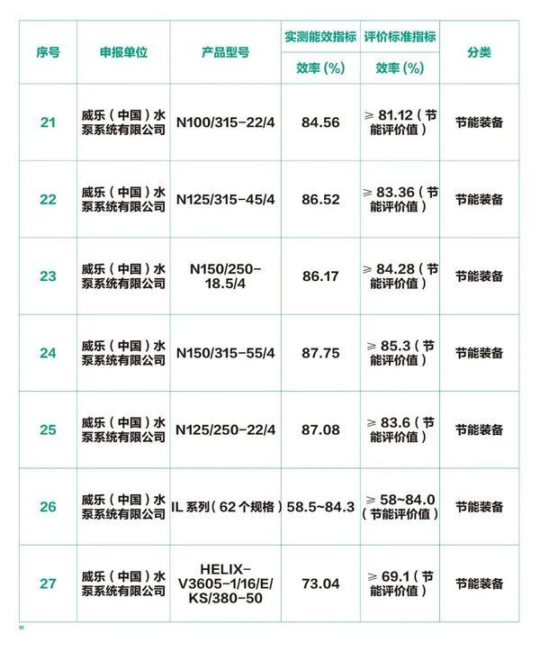 在工信部节能与综合利用司发布的《国家工业节能技术推荐目录(2021)》、《“能效之星”装备产品目录(2021)》与《国家通信业节能技术产品推荐目录(2021)》中公告中,威乐中国有68个型号的高能效水泵产品被评为了“节能装备”,是其中获奖型号最多的企业