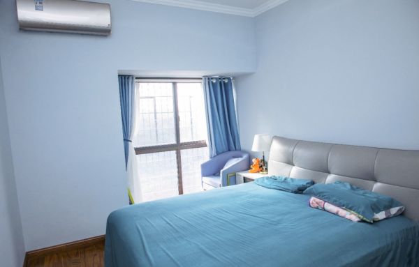 次卧,舒适简约的搭配风格,大大的落地窗让房间光线通透,灰色床头搭素蓝色的枕头床单,整个空间显得格外的简约温馨而舒适。