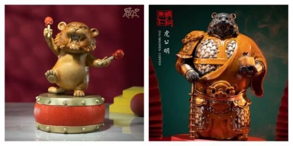 除了众多萌虎好礼,猛虎代表——铜师傅的得胜虎和虎大侠、朱炳仁的虎公明同样是送礼好选择。在中国传统文化中,寅虎是正义、勇猛、威严和权势的象征,更有护佑平安、献祥送福的美好含义,这几件纯手工打造的全铜摆件,便将虎之霸气表现得淋漓尽致。