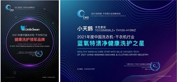 在2021中国洗衣机·干衣机行业高峰论坛上,小天鹅凭借其在健康洗护领域上的突出表现与技术杰出,成功获得了“健康洗护领军品牌”的称号。而蓝氧科技加持下的小天鹅本色系列洗烘套装,在洗烘过程中打出“纳米银离子抗菌晶体+紫外线杀菌”的组合拳,也被授予“蓝氧特渍净健康洗护之星”荣誉称号。