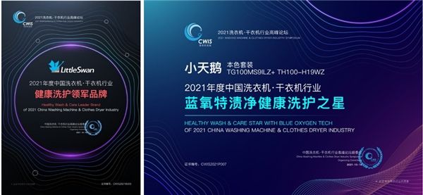 在2021中国洗衣机·干衣机行业高峰论坛上,小天鹅凭借其在健康洗护领域上的突出表现与技术领先,成功获得了“健康洗护领军品牌”的称号。而蓝氧科技加持下的小天鹅本色系列洗烘套装,在洗烘过程中打出“纳米银离子抗菌晶体+紫外线杀菌”的组合拳,也被授予“蓝氧特渍净健康洗护之星”荣誉称号。