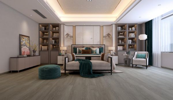 高级灰是近几年家居界比较流行的颜色,克制、冷静的颜色自带高级属性。高级灰被用于很多风格的空间之中,比如现代简约、北欧风、工业风等。现在颇有想法的设计师把高级灰也应用在新中式的空间之中。现代感十足的灰色让整体空间更具现代的时尚度。造型古朴、材质则是现代的,房间的吊灯本身就是传统中式现代运用的典范。气韵生动的山水画展现出自然美景的清幽淡雅。对卧室空间来说,温暖安静的舒适感十分重要。空间主题颜色是灰色,地面就巧妙的搭配了更温柔自然的原木色系的地板。卢森地板冰谷橡木优雅的肌理感线条和有格调的配色,十分符合现代的审美和功能性需求。当代系列定义正在书写历史的现代生活。