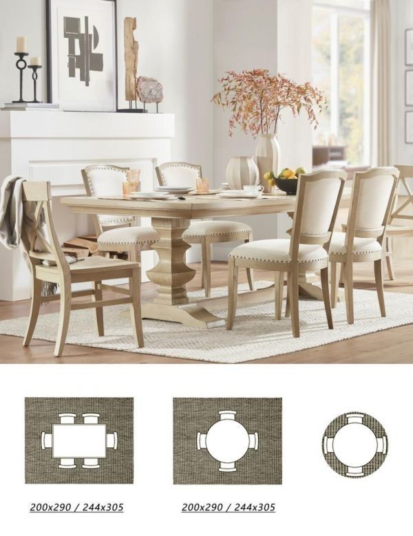 餐厅配地毯也要配合餐桌来挑选,大小就是把餐桌餐椅包进去,再延伸出去10cm-20cm左右就刚好合适,以下是200x290 / 244x305尺寸的地毯,与餐桌搭配的尺寸效果。此外,圆餐桌搭配圆形地毯视觉效果更好。