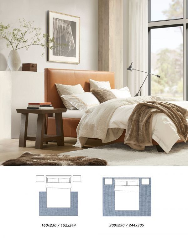 卧室中的地毯一般铺设在床侧或床头,将地毯伸进床下一半,长度建议铺设到床脚或据床脚25-35cm的距离,宽度任意。