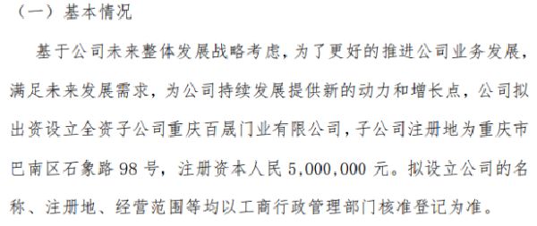 门窗快讯|万通新材拟投资设立全资子公司重庆百晟门业有限公司