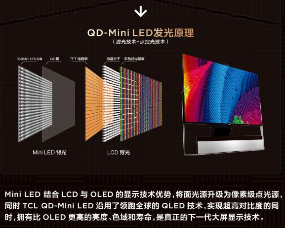 与行业大多数Mini LED背光源液晶显示系统不同,TCL的QD-Mini LED在发光层和偏转层之间,加上一层QD量子点层,经过纳米级量子点材料,实现10亿级的色彩,色域更广,色彩更纯,更久。因此,TCL的QD-Mini LED技术兼具LCD和OLED的优势,突破性的解决了微粒LED芯片巨量转移的行业技术难题,是显示行业的一次革命性升级。