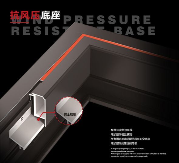 为加强门窗的安全性,H-3断桥平开窗整框拼接压线,风压越大,受力越强,此外所有固定玻璃标配抗风压安全底座,增加整体抗风压性能等级,轻松应对恶劣天气。