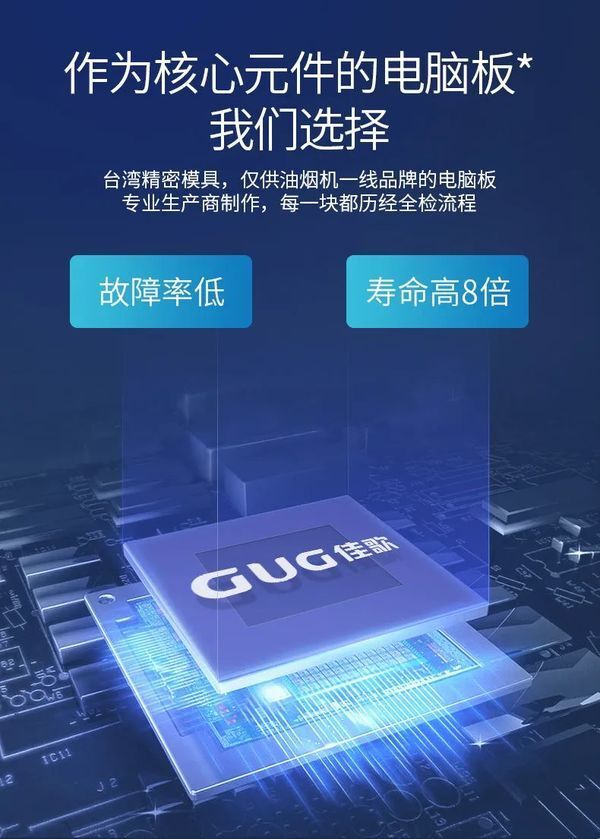 佳歌集成灶下置灌胶电脑板,防水防尘且离发热源——灶台的距离足够远,不会有受热损坏的风险。卸下两个螺丝电脑板就可以直接拿出来,售后维修更换简单便捷。